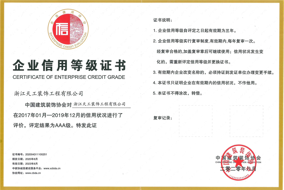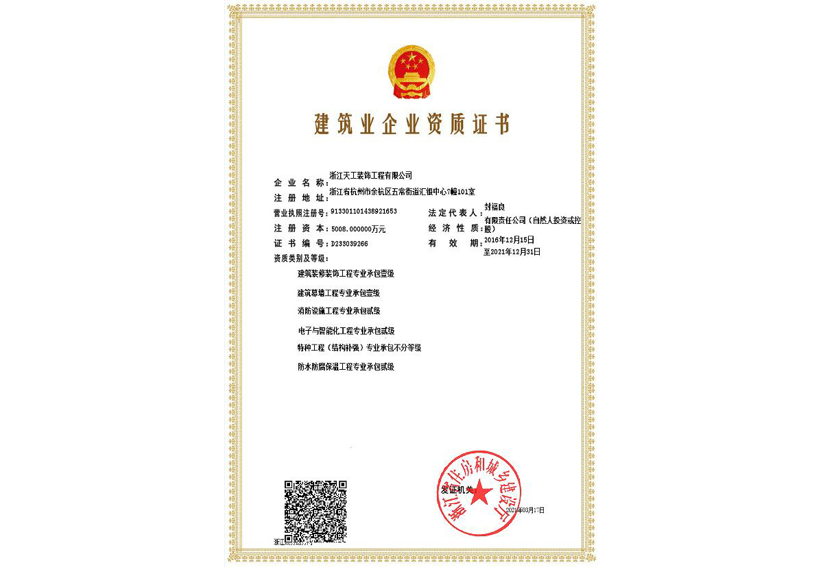 浙江天工裝飾工程有限公司成立于1994年,是一家專注于建筑行業(yè)近三十年,余杭區(qū)內(nèi)規(guī)模最大、最專業(yè)的現(xiàn)代化專業(yè)承包企業(yè),連續(xù)十二年榮獲“余杭區(qū)建筑業(yè)十強企業(yè)”稱號。公司現(xiàn)任余杭區(qū)建筑裝飾行業(yè)協(xié)會會長單位、杭州市建筑裝飾行業(yè)協(xié)會副會長單位、浙江省建筑裝飾行業(yè)協(xié)會副會長單位、中國建筑裝飾協(xié)會理事單位。公司具備建筑裝修裝飾工程專業(yè)承包壹級、建筑幕墻工程專業(yè)承包壹級、建筑裝飾工程設(shè)計專項甲級、建筑幕墻工程設(shè)計專項甲級、展覽陳列工程設(shè)計施工一體化貳級、電子與智能化工程專業(yè)承包貳級、消防設(shè)施工程專業(yè)承包貳級、防水防腐保溫工程專業(yè)承包貳級,集建筑工程施工總承包、建筑機電安裝、城市及道路照明、鋼結(jié)構(gòu)、結(jié)構(gòu)補強、安防施工等多項資質(zhì)。主要從事大型公共建筑、星級酒店的室內(nèi)精裝修、建筑幕墻及建筑智能化工程的設(shè)計與施工。 天工裝飾始終把建筑裝飾當(dāng)作一項 “美的事業(yè)”,在施工中嚴(yán)把質(zhì)量關(guān),不斷規(guī)范和提升工程技術(shù)標(biāo)準(zhǔn)。近年來,公司承建的浙商開元名都國際酒店I標(biāo)段裝飾工程、杭州藝尚雷迪森廣場酒店裝修工程、余杭區(qū)時代廣場5號樓(市民之家)室內(nèi)裝飾工程、永安之星室內(nèi)裝飾工程、青山湖科技城創(chuàng)業(yè)廣場裝修工程、杭州未來科技城醫(yī)院室內(nèi)裝飾工程、杭州師范大學(xué)附屬實驗學(xué)校裝修工程、杭州老板電器股份有限公司辦公樓裝飾工程、深川控股集團綜合樓幕墻工程、浙江省科技信息研究院幕墻工程、北航杭州創(chuàng)新研究院(余杭)內(nèi)裝及智能化提升改造項目(研究生院)工程、臨平新城人才服務(wù)中心設(shè)計釆購施工(EPC)工程總承包項目、浙江大學(xué)先進電氣裝備創(chuàng)新中心室內(nèi)外裝飾及改造項目設(shè)計采購施工(EPC)工程總承包項目等,先后獲得“中國建筑工程裝飾獎”、“全國建筑裝飾科技創(chuàng)新獎”、浙江省建設(shè)工程“錢江杯”優(yōu)質(zhì)工程獎、杭州市建設(shè)工程“西湖杯”優(yōu)質(zhì)工程獎、嘉興市建設(shè)工程“南湖杯”優(yōu)質(zhì)工程獎、“浙江省優(yōu)秀建筑裝飾工程獎”、“浙江省優(yōu)質(zhì)安裝質(zhì)量獎”等榮譽。 天工裝飾恪守“誠實守信、文明經(jīng)營”,近年來公司得到了客戶的信賴也獲得了業(yè)界的好評,先后被評為“國家級守合同重信用單位”、“全國建筑裝飾行業(yè)AAA級信用企業(yè)”、“全國百家科技創(chuàng)新型企業(yè)”、“浙江省AAA級守合同重信用單位”、“人民銀行信用等級AAA級企業(yè)”、“浙江省信用管理示范企業(yè)”、“浙江省誠信企業(yè)”、“浙江省建筑裝飾行業(yè)強優(yōu)企業(yè)”、“杭州市建筑業(yè)優(yōu)秀企業(yè)”、“余杭區(qū)建筑業(yè)十強企業(yè)”、 “余杭區(qū)人民政府質(zhì)量獎”等榮譽。